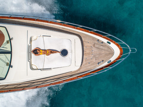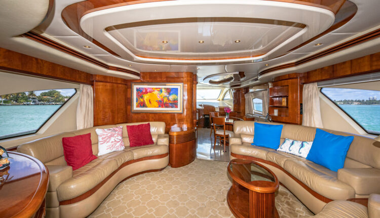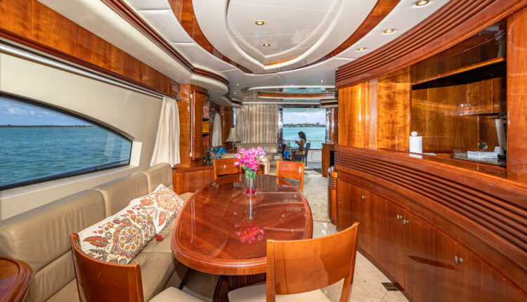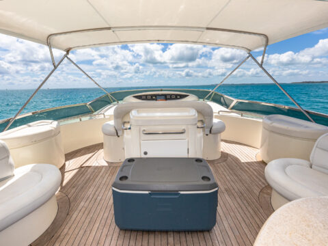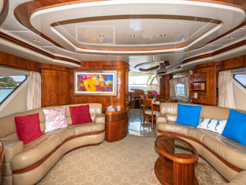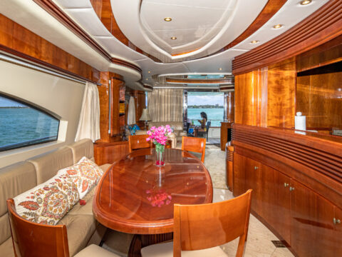 The Azimut 80’s salon is elegantly designed with large windows that provide panoramic views of the surrounding waters, creating a bright and inviting atmosphere. It features a comfortable seating area, a dining table for entertaining, and a fully-equipped galley with modern appliances for gourmet dining onboard.