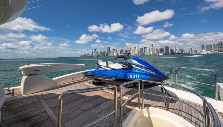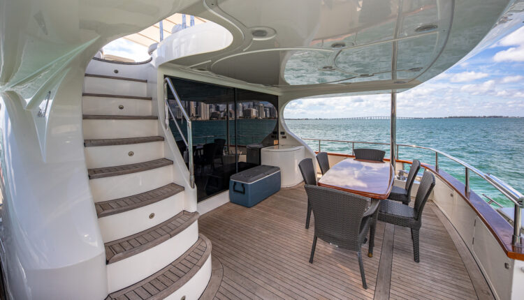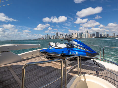 The outdoor areas of the yacht are equally impressive, with a spacious flybridge that includes a helm station, ample seating, a wet bar, and a grill for outdoor dining and entertainment. The aft deck offers additional seating, a dining area, and a hydraulic swim platform for easy access to the water.