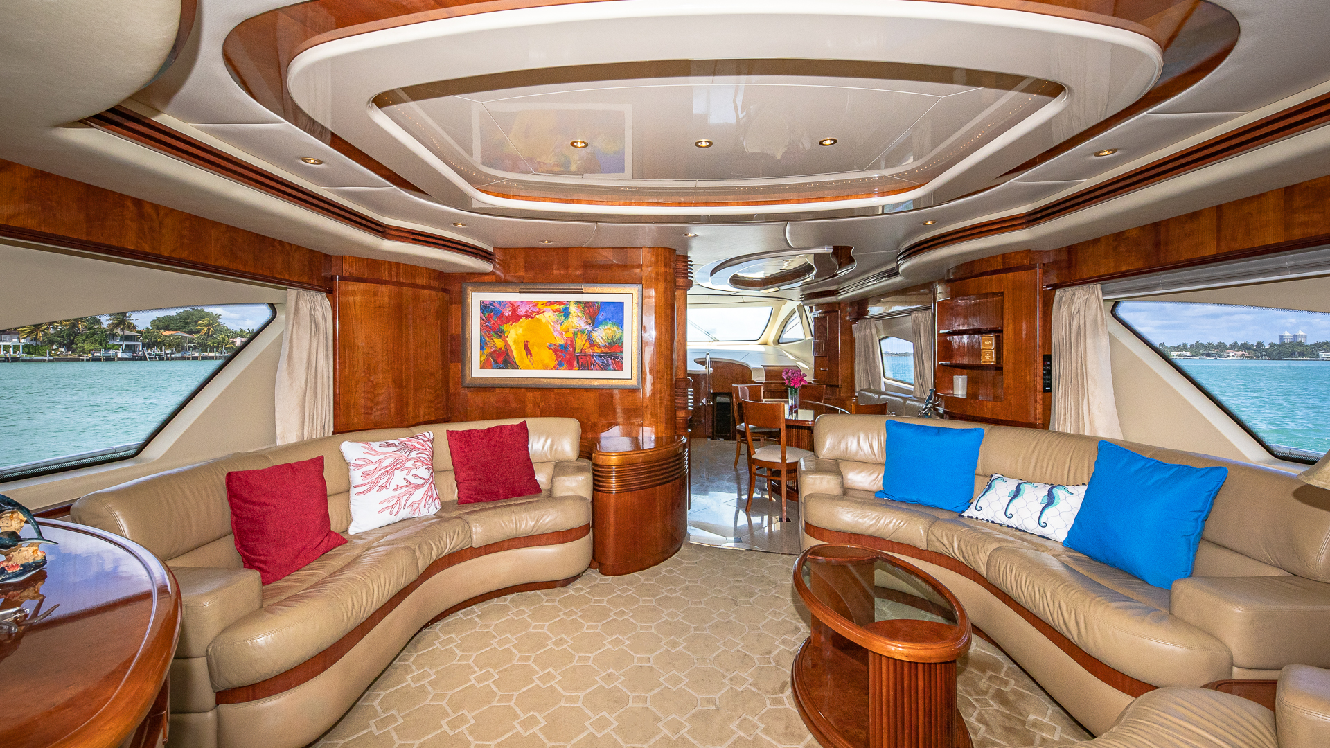 The Azimut 80’s salon is elegantly designed with large windows that provide panoramic views of the surrounding waters, creating a bright and inviting atmosphere. It features a comfortable seating area, a dining table for entertaining, and a fully-equipped galley with modern appliances for gourmet dining onboard.